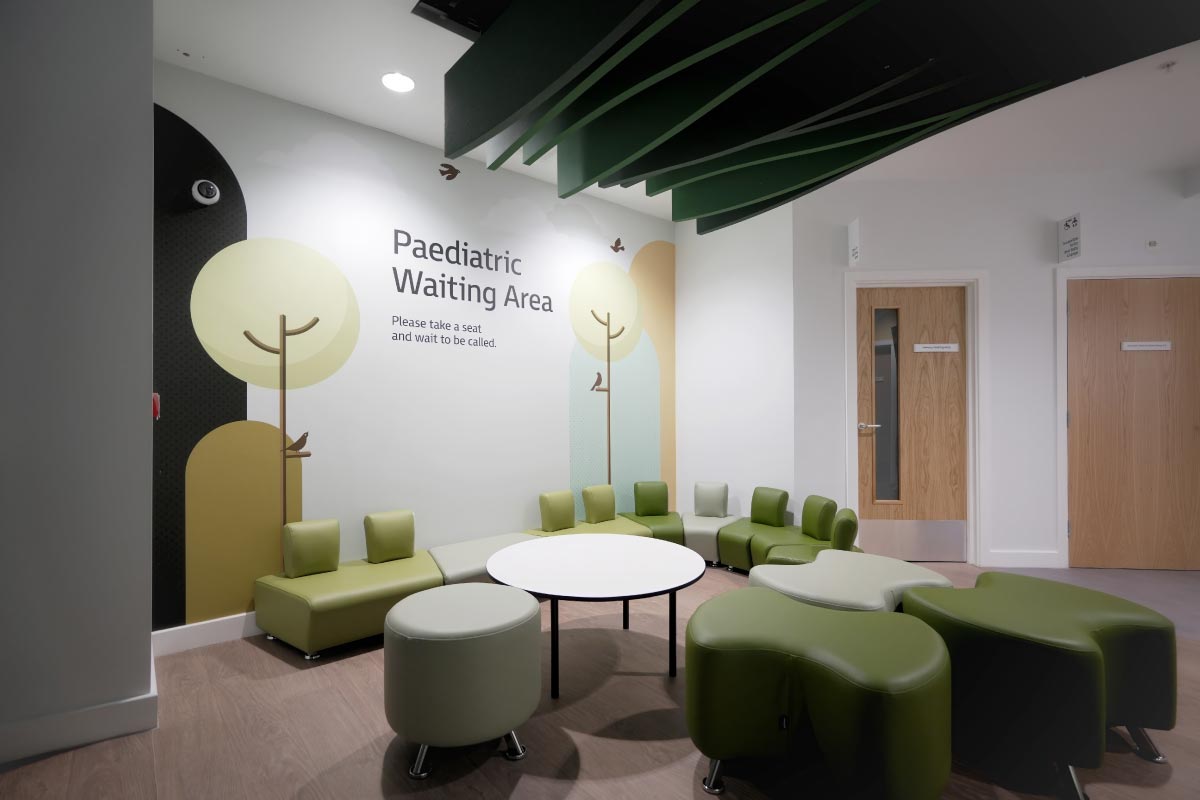 The paediatric waiting area has been thoughtfully designed to create a cosy, calming environment for children and their families. Soft green tones are used throughout to promote a sense of calm and comfort, helping to reduce anxiety and create a more reassuring healthcare experience.
